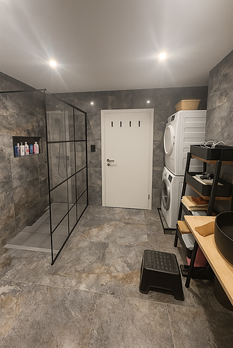 Großformatige Fliesen in Natursteinoptik schaffen ruhige, fugenarme Flächen. Die bodengleiche Walk-in-Dusche mit schwarz gerahmter Glasabtrennung und gefliester Nische setzt klare Linien. Schwarze Unterputz-Armaturen und der Doppelwaschtisch auf Massivholz wirken hochwertig und modern. LED-Deckenspots sorgen für eine gleichmäßige Ausleuchtung; Waschmaschine und Trockner sind funktional integriert.